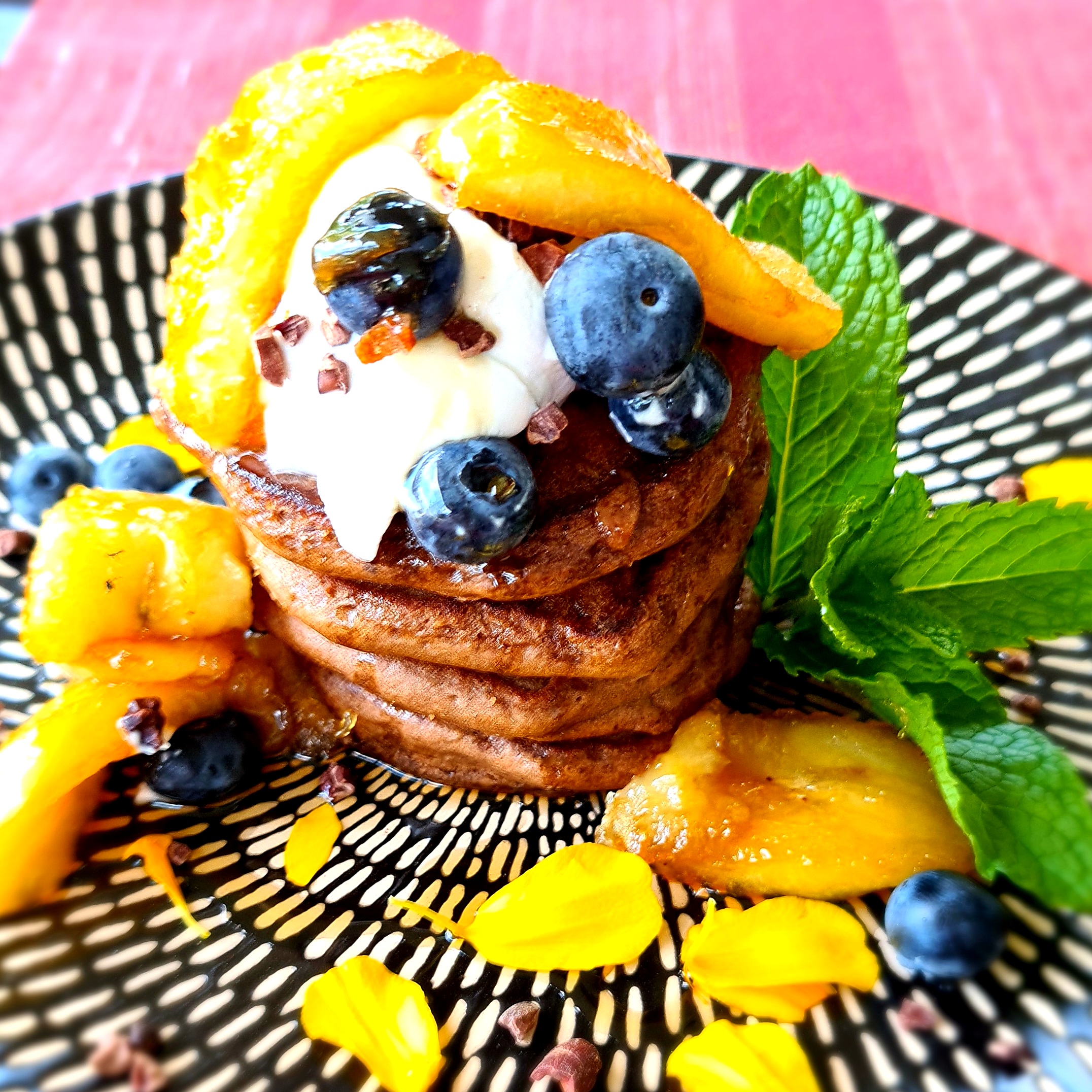 Chocolate pancakes with rosella syrup